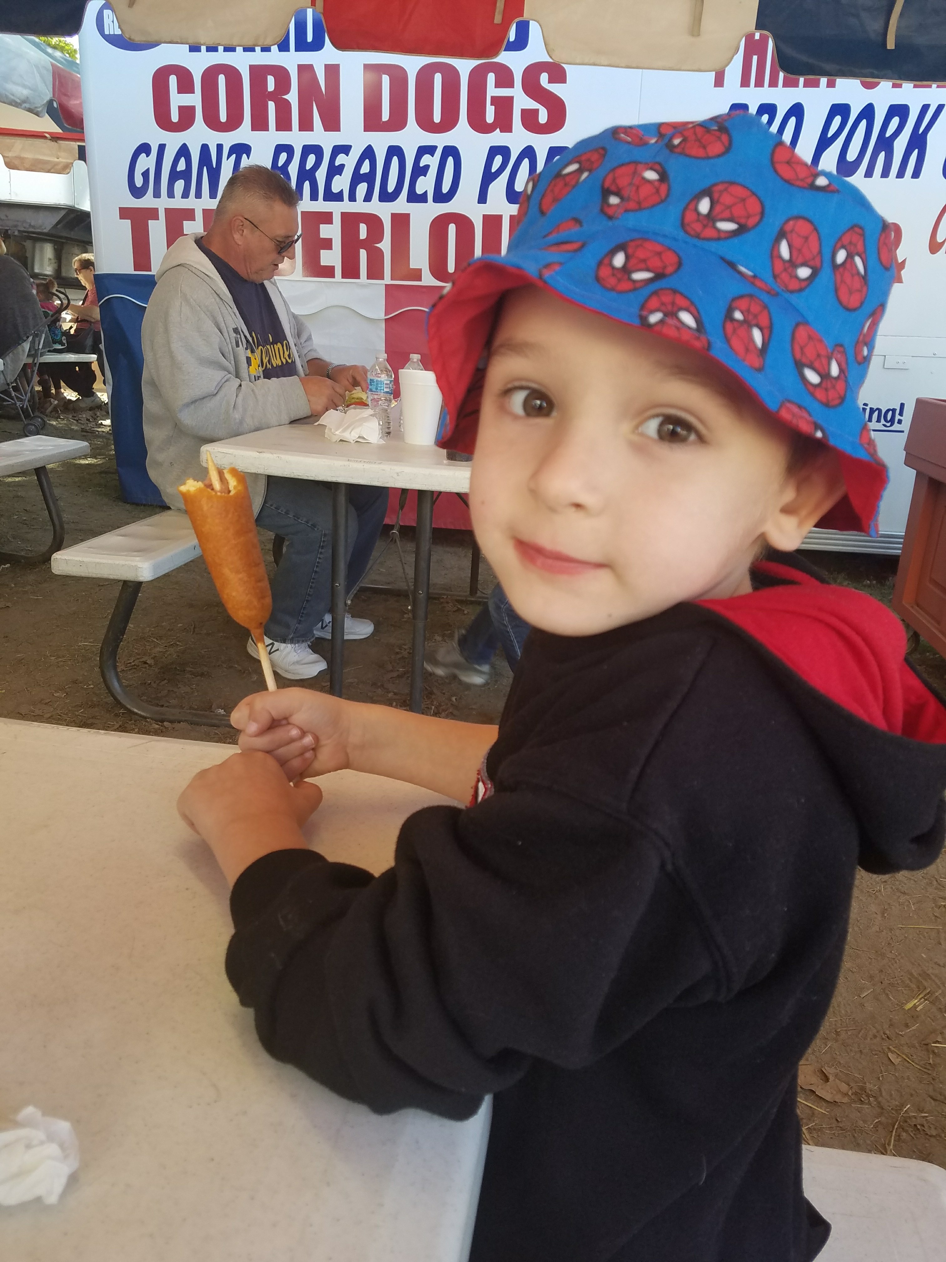 We made our way into town, and Matt’s grandma got us into the fair with no charge, however I was there ten minutes and had already spent $40. I got tickets for Chase to ride the rides, and got us lunch. Which just fyi, if you ever get a chance to have a pretzel wrapped brat for the love of all things holy spend the $7 and get it. Who ever invented that is my hero. Chase got a corn dog and Matt a baked potato and even though I spent more on these three items and two pops than what I would spend at a restaurant for a full meal, there is nothing like fair food.