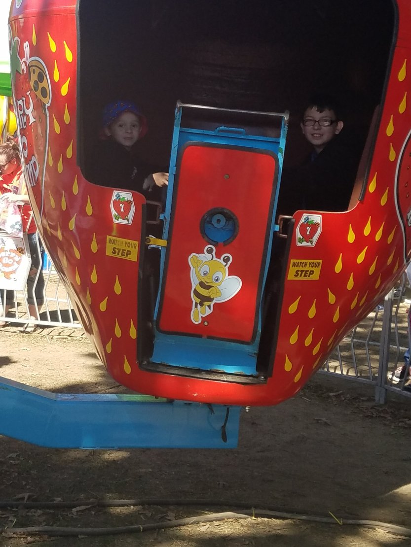 Chase rode the rides, and Matt joined him for a couple. We walked around and enjoyed the sights and smells. It was positively gorgeous out with a high of 65°, and the sun was shining. Our first stop, as always, was “the strawberries”. If you’ve never encountered this ride, it spins around and there’s a wheel inside that you turn to make your individual car spin, as well. This is a favorite of my boys, and was mine as a kid, as well. It will be a sad day of the ride is ever retired.