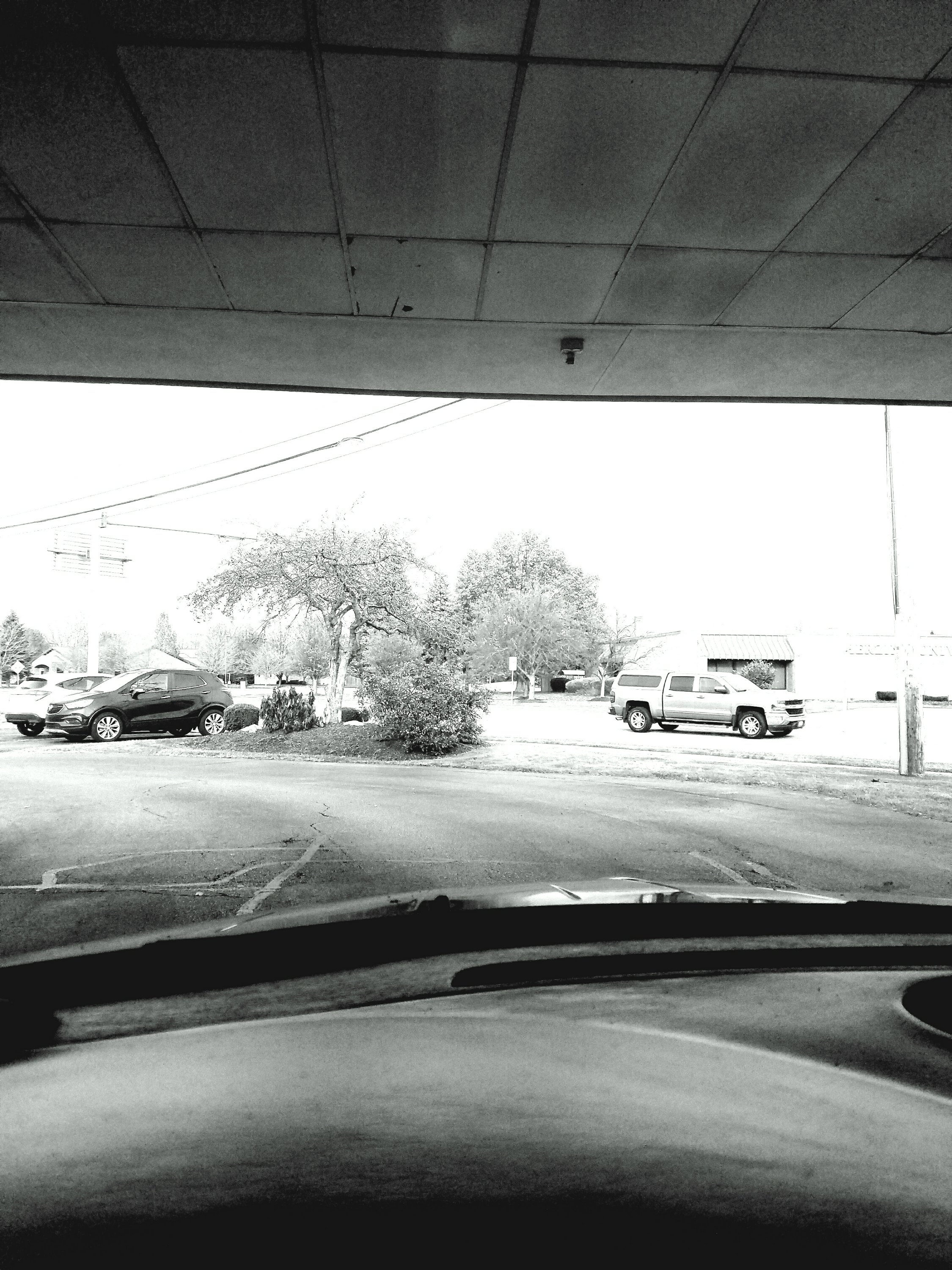 In this photo I’m at the bank waiting for the teller to cash the check so I can go get office supplies. The alarm actually sounded while I was driving, however.