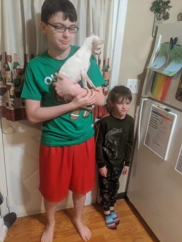 Soon Matt was bounding through the door, all smiles. “Dad got Meeha!” he told me as his dad followed behind him into the apartment. He carried a small white thing in his arms, and a bag.