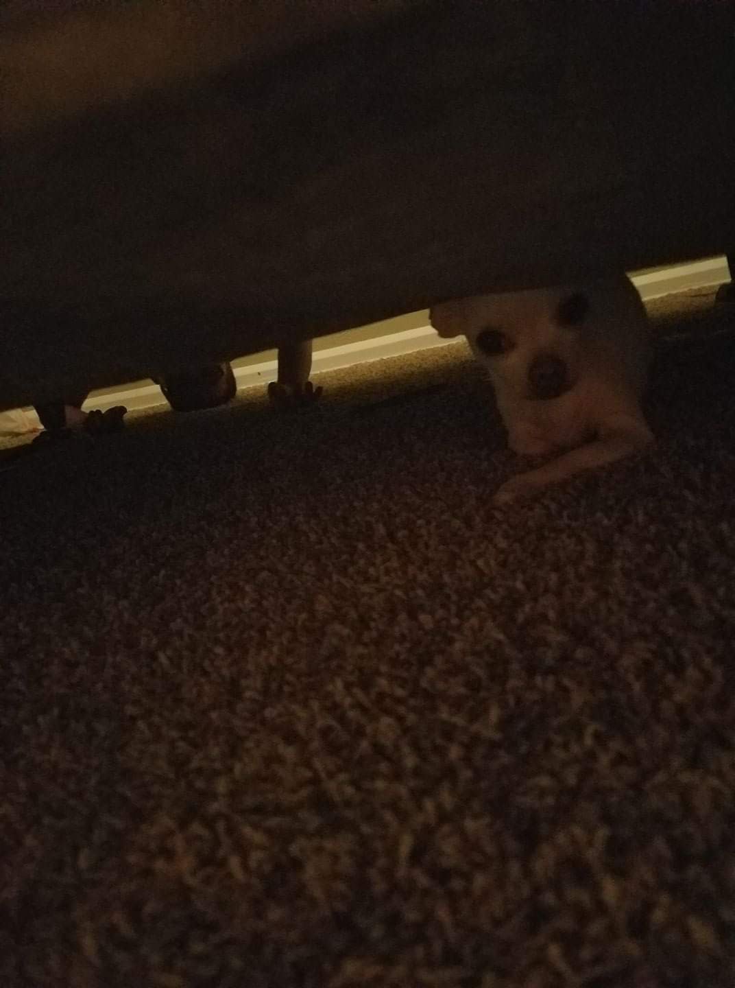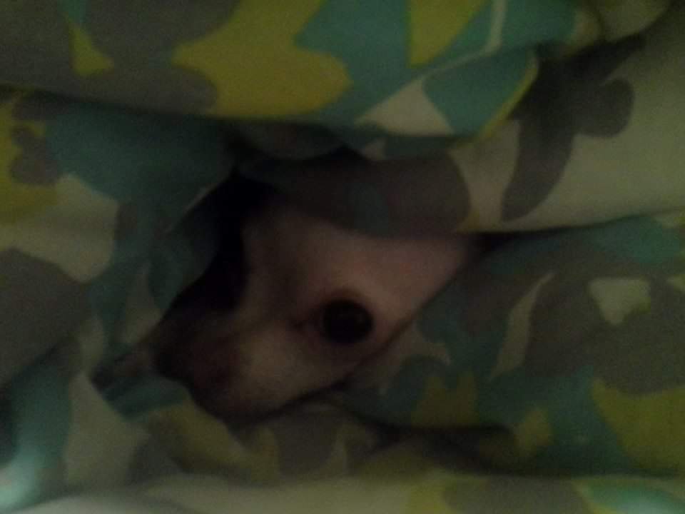 After his dad left, Matt attempted to play with the dog, much to her dismay. She seemed content to just sit on the couch and shake. Poor kid needs a real dog, I thought to myself. You know, the kind you can throw a stick for and not be worried that the stick would be bigger than the dog? I made dinner and got Matthew ready for bed. He insisted that Meeha wanted to sleep with him, despite the panicked look on her little rat face when I placed her in bed with him. She quickly escaped and hid under my bed while Matt cried. I tried to talk the dog out, but she refused to make eye contact with me as I sat on my knees on the floor, peering under the bed skirt. “Maybe she will sleep with you once she gets comfortable, kiddo. She’s awful scared being in a new place.” Matt seemed to understand so I left the dog under my bed and my child in his bed and went and sat on the couch to read.