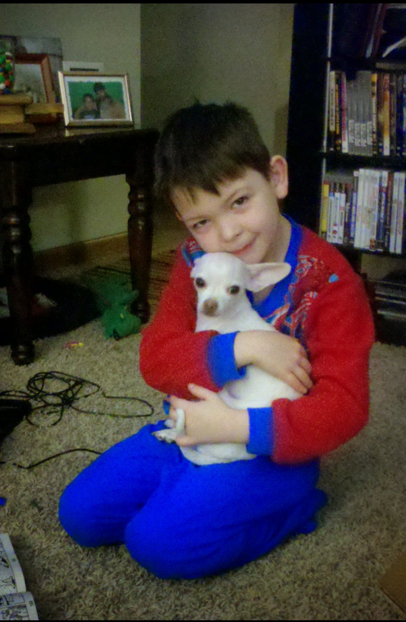The same dog took on a grown adult who was playing a trick on Matthew, trying to hide and scare him. I never saw the little thing be so vicious, as she tried to bite the person who seemed to be threatening her boy. Matt was one of her humans, apparently.