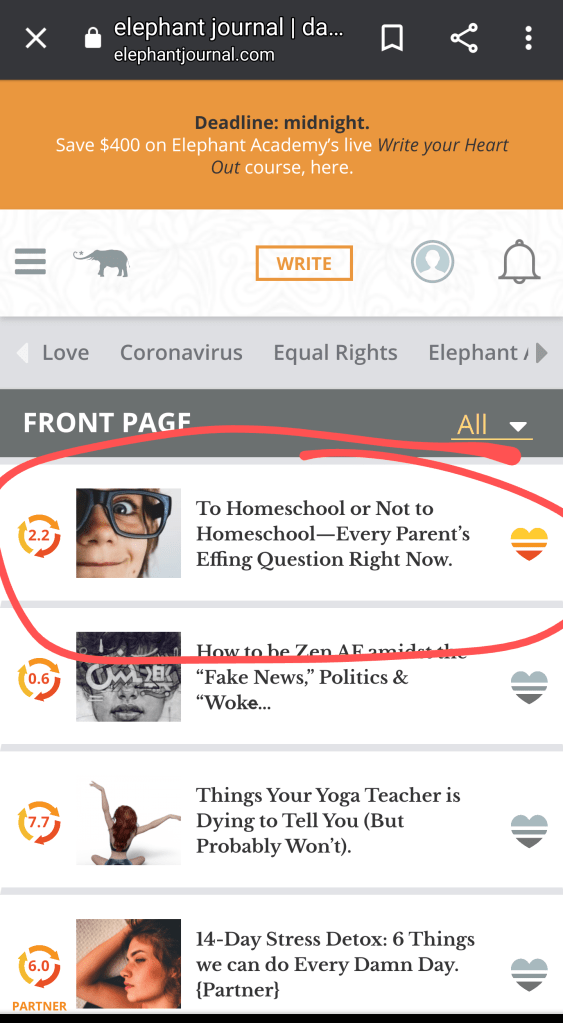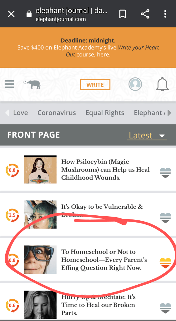 So I made an author bio, took the piece I had written for another website that had been denied, did some editing, and posted it to the Elephant Journal website. I had thought it was good, and thought honestly it had been denied simply because my opinion was prevalent in the piece, thus making it fairly controversial. There was an option to send it to the editors at Elephant Journal for consideration, and there was an option to just post it and see what happened with it. I opted for the latter – Sending it to the editors had a 7-10 day processing time, and I wasn’t sure I was ready for another rejection just yet. I really wanted to just see what would happen with it as it was. I didn’t even upload a picture with it. I just posted it and went on with my life.